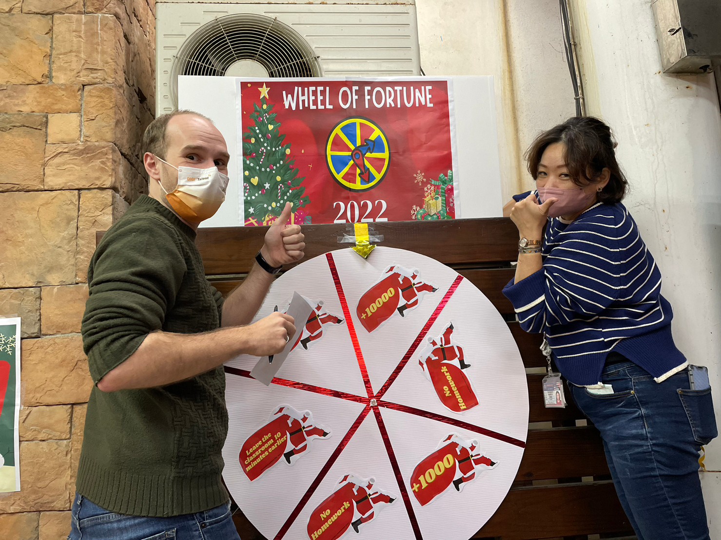 耶誕~是充滿驚喜是歡笑分享的日子今天在中外師的巧思下華聖頓縣政美語的孩子超期待的”幸運轉盤”終於開始啟動了N0 homework! 10000 points! Leave the classroom 10 minutes earlier.哇!哇!哇!的驚叫聲及開心的笑聲,孩子們超喜歡這份耶誕禮物的喔!Merry X’mas~耶誕快樂